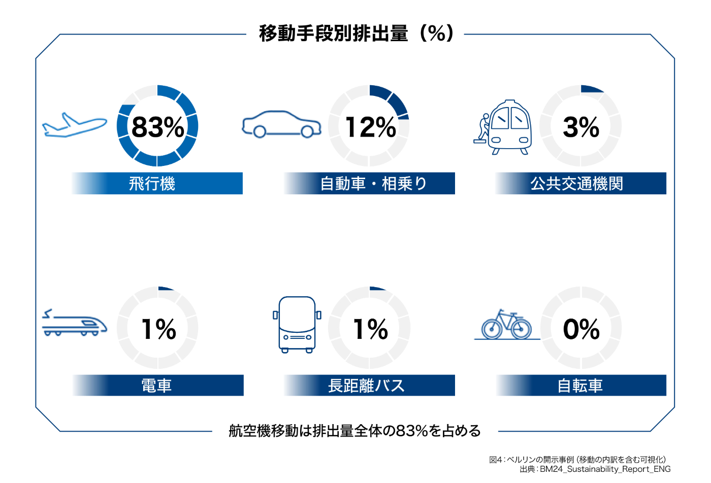 ベルリンは、排出量の大きい「移動」について交通手段別の割合なども示し、「何が大きいのか」を理解しやすい形で提示しています。行動変容(移動手段の選択など)を促しやすい点が特徴です。