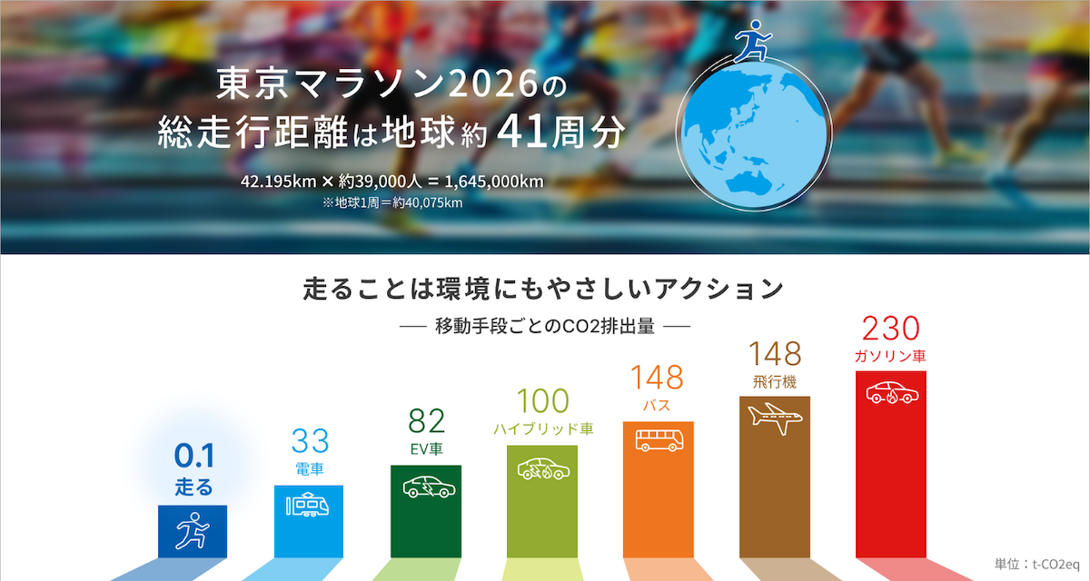 東京マラソン2026では、約39,000人のランナーが42.195kmを走り、合計約164.5万kmを“人の力”だけで移動します(地球約41周分)。